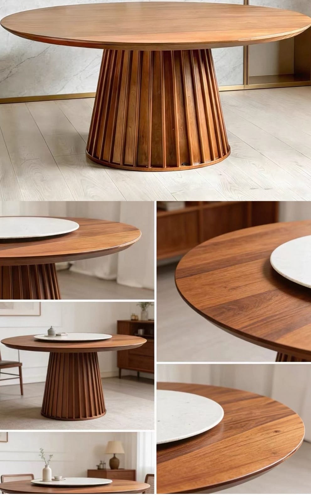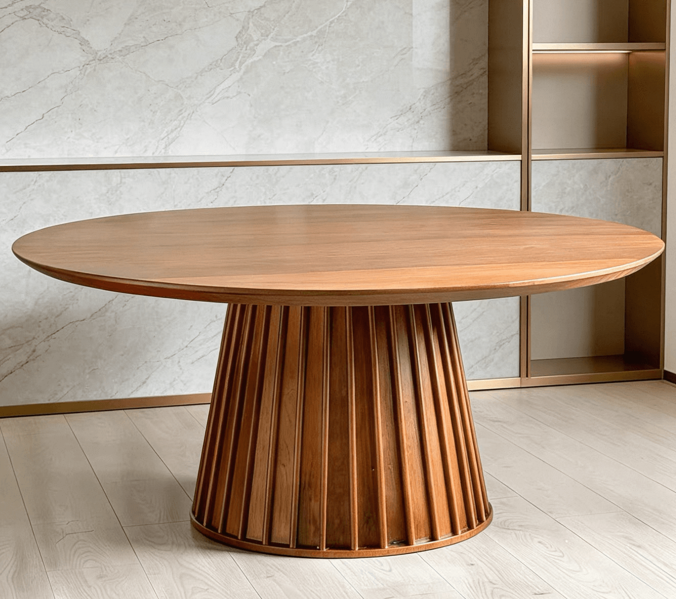 The design seamlessly blends the sleekness of modern furniture with a sophisticated slatted pedestal base. Its elegant silhouette not only enhances the aesthetic appeal of any space but also creates a warm, inviting atmosphere for dining and gathering.